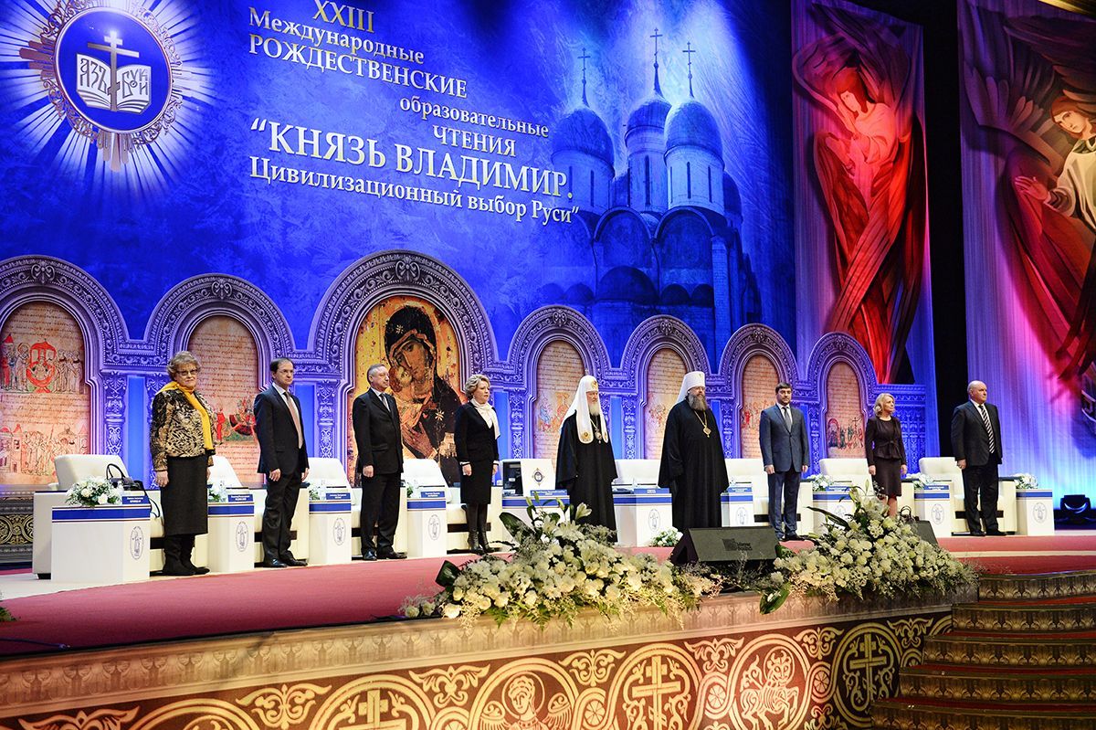 В президиуме Чтений присутствовали: председатель Совета Федерации ФС РФ В.И. Матвиенко; председатель Синодального отдела религиозного образования и катехизации и Оргкомитета Международных Рождественских образовательных чтений митрополит Ростовский и Новочеркасский Меркурий; руководитель рабочей группы при Президенте РФ по подготовке мероприятий, посвященных памяти святого равноапостольного великого князя Владимира, полномочный представитель Президента РФ в Центральном федеральном округе А.Д. Беглов; министр культуры РФ В.Р. Мединский; заместитель председателя Государственной Думы ФС РФ, сопредседатель рабочей группы по проведению Рождественских Парламентских встреч С.В. Железняк; первый заместитель министра образования и науки РФ Н.В. Третьяк; статс-секретарь — заместитель министра иностранных дел РФ Г.Б. Карасин; президент Российской академии образования Л.А. Вербицкая.