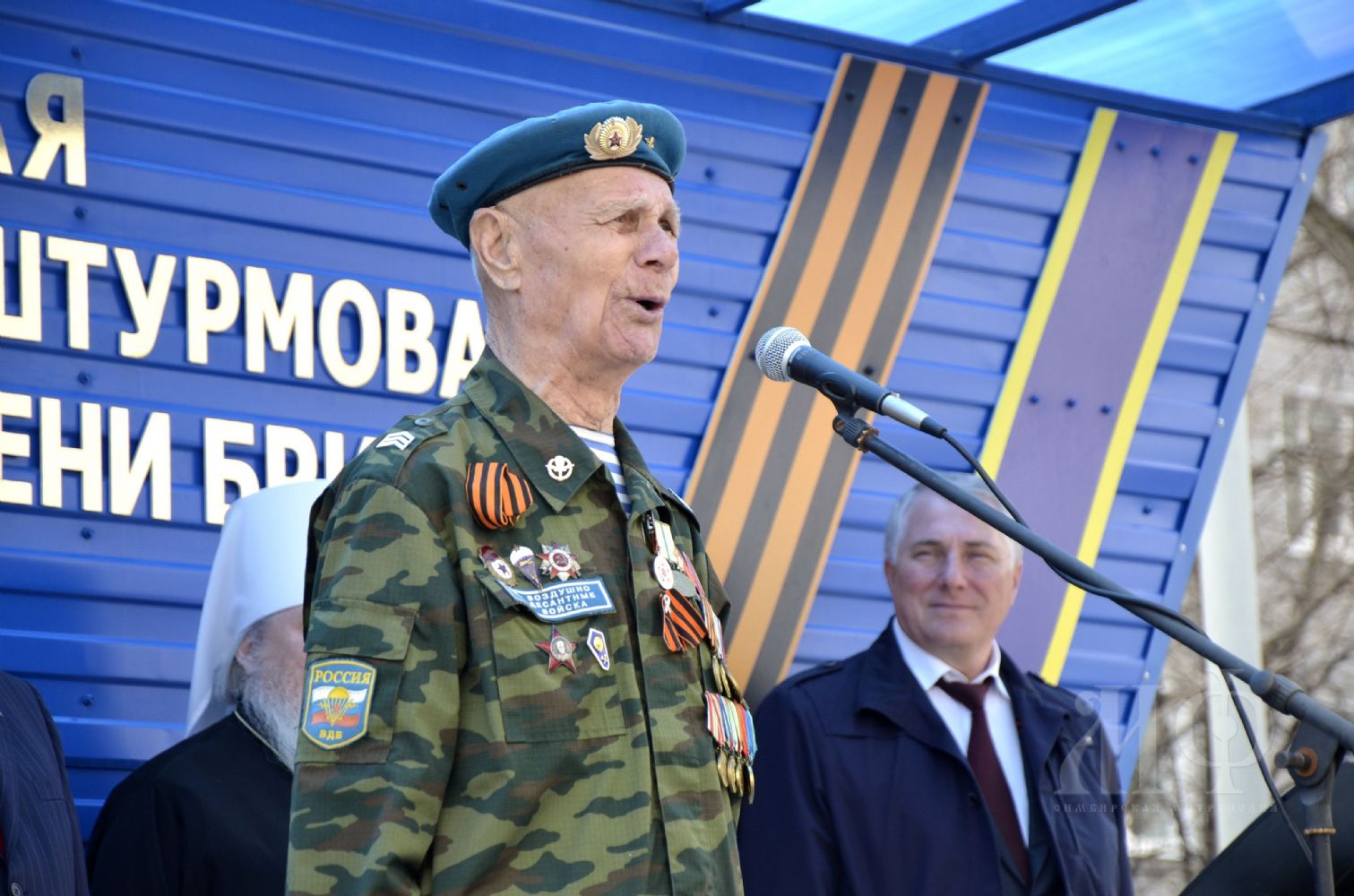 Затем к десантникам обратился председатель Совета ветеранов 31-й отдельной гвардейской десантно-штурмовой ордена Кутузова бригады генерал-майор Вадим Орлов: «Желаю вам воинской удачи. Чтобы вы всегда были не только первыми, но и лучшими, и не только в воинской службе, но и в жизни. Семейного вам благополучия и мирного неба над головой!» Также гвардейцев поздравили ветераны службы и ветераны Великой Отечественной войны.