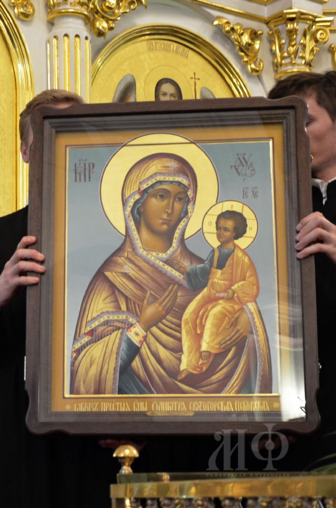 В дар собору Святейший Владыка передал список Смоленской иконы Божией Матери «Одигитрия». Верующим были розданы иконки Вознесения Христова с Патриаршим благословением.