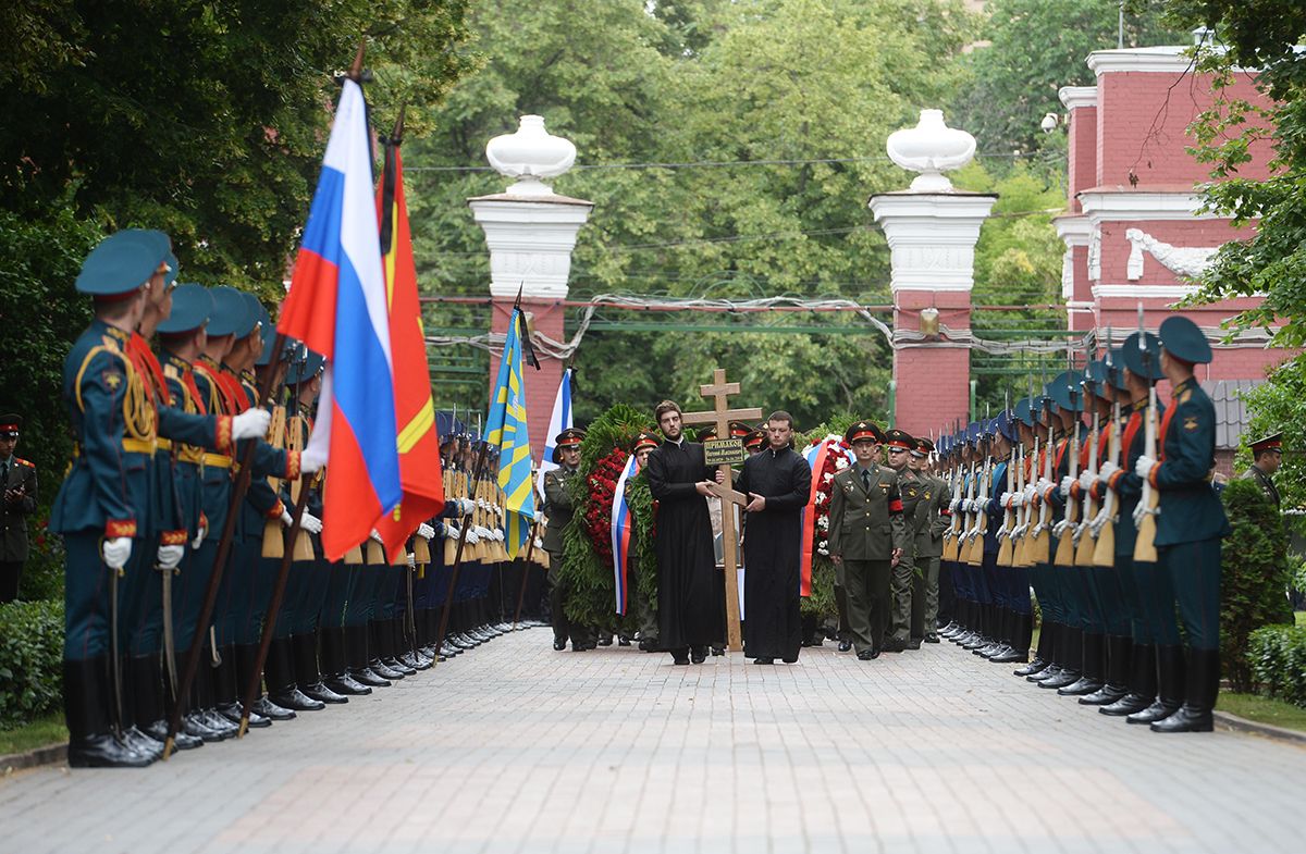 По окончании заупокойного богослужения, согласно государственной церемонии прощания, гроб был водружен на орудийный лафет, и траурная процессия направилась на Новодевичье кладбище. После церемонии передачи флага РФ вдове усопшего под пение «Трисвятого» тело было предано земле.