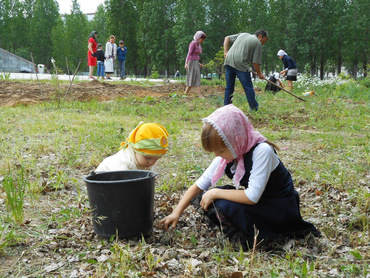 Еженедельно с наступлением летнего сезона ребята совместно с папами, мамами и педагогами школы убирают территорию храма и ухаживают за зелеными насаждениями. В этом году на прилегающей к храму территории прихожане своими силами разбили сад: кроме цветов сюда привезли и высадили саженцы яблонь, груш, вишен, организовали грядки с клубникой, помидорами. Тут же разбили и небольшой виноградник.