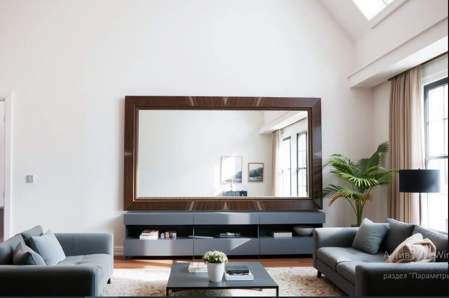 В гостиной зеркала выполняют в основном декоративную функцию. Наиболее удачное расположение — на стене напротив окна. Это позволяет отражать естественный свет и визуально увеличивать площадь помещения на 25–35%. Расстояние от пола до нижнего края зеркала должно составлять 80–100 см для сидячего обзора. Крупные зеркала (более 1,5 м в высоту) лучше размещать на свободных стенах, не загромождённых мебелью. Для создания композиции можно использовать несколько зеркал одинакового или разного размера, выстраивая их в геометрические узоры.