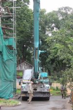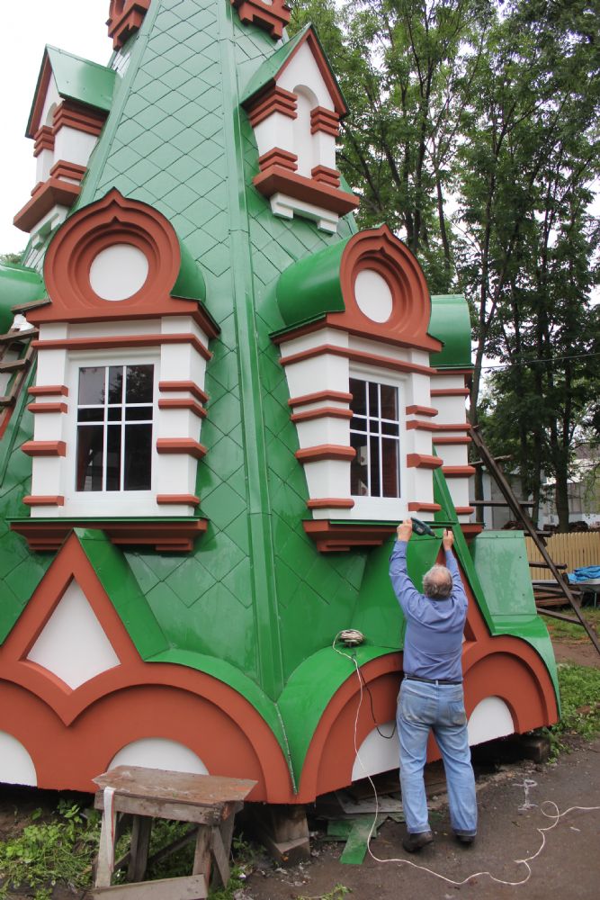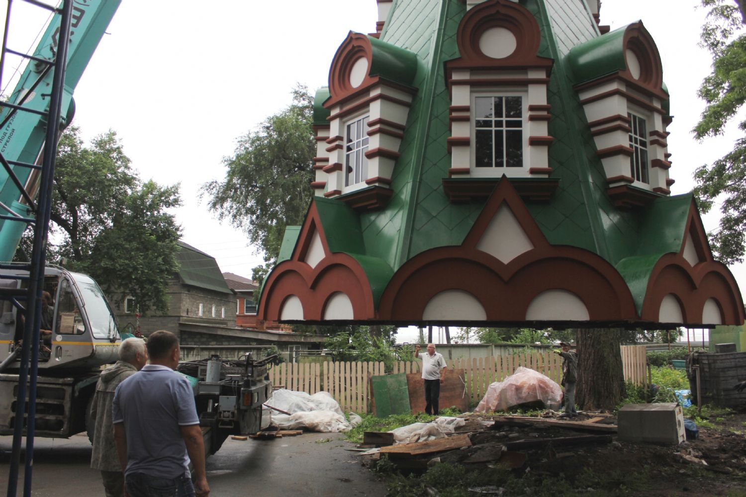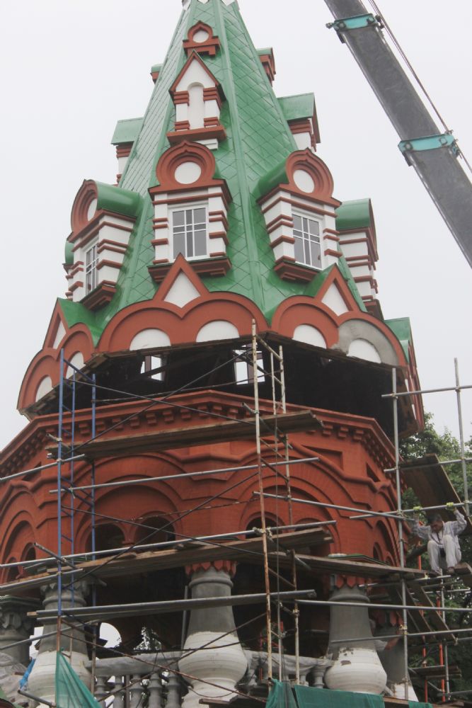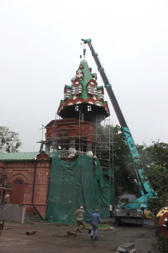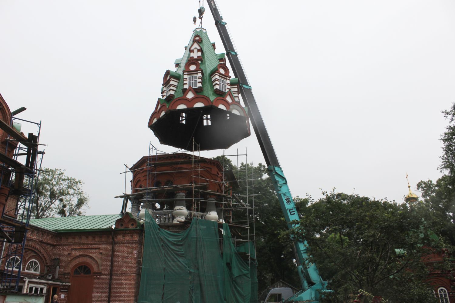 В среду, 31 июля 2013 года на колоннаду была установлена следующая часть колокольни – конусовидная шатровая конструкция. Работы производились с применением двух подъемных кранов, силами подрядчика - ООО «Дальстройбизнес II».