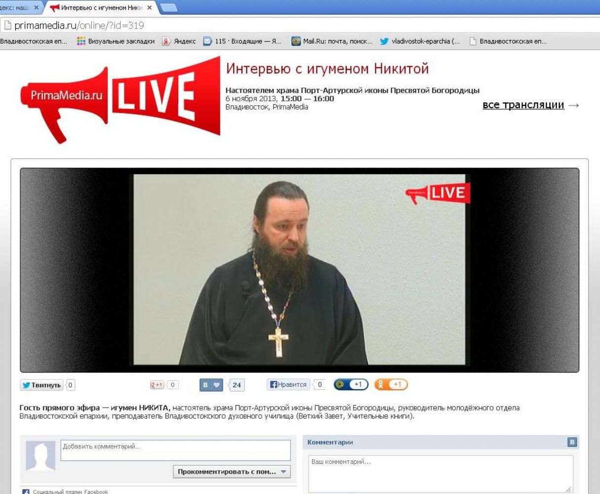Владивосток. 6 ноября 2013 года на сайте одного из наиболее рейтинговых информационных агентств – «Примамедиа» состоялся прямой телеэфир, посвященный вопросам духовной жизни.