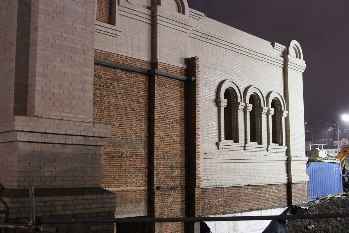 Справка. Строительство Спасо-Преображенского кафедрального собора ведется во Владивостоке с весны 2011 года. К настоящему времени проделана значительная часть работ – на мощном фундаменте сооружен цокольный этаж и возводятся стены храма и мощные колонны. Стены собора будут напоминать «белокаменные» – их облицовывают особым светлым декоративным кирпичом.