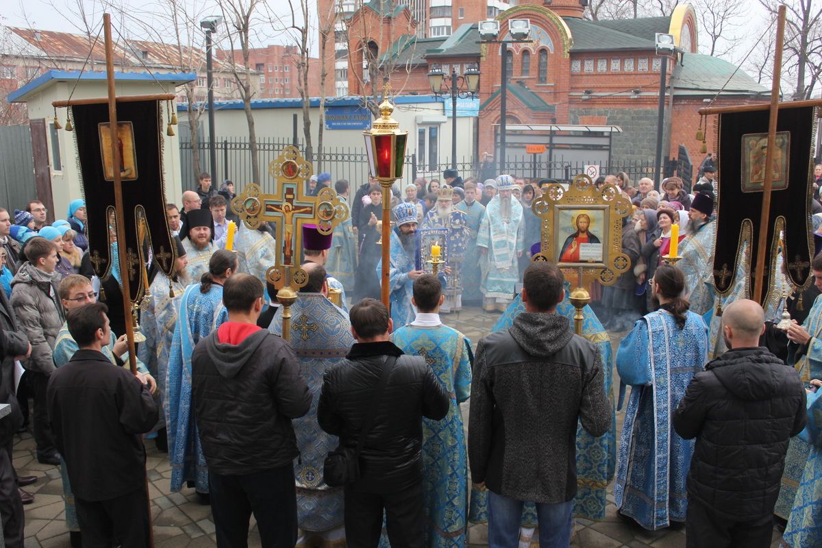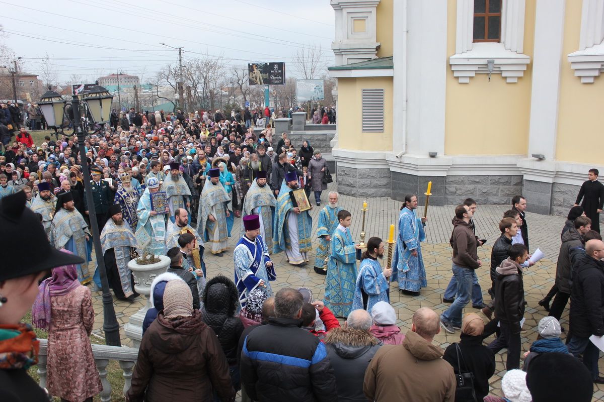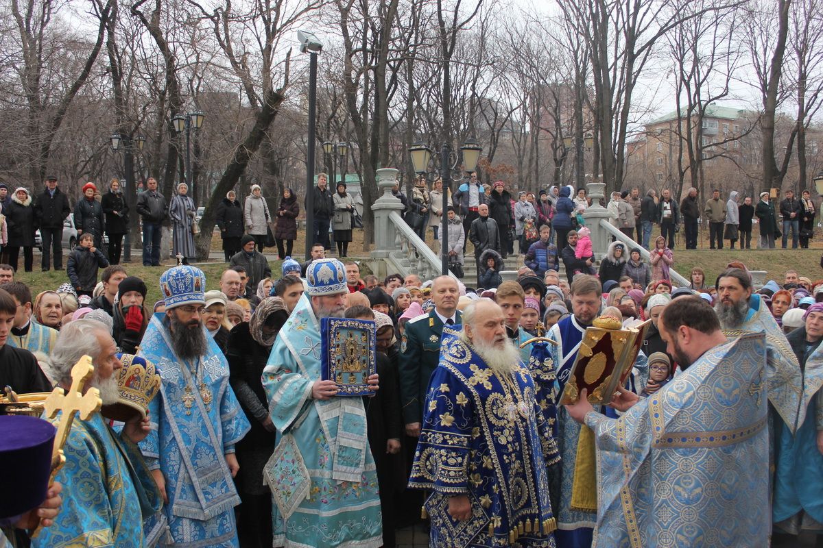 Сотни приморцев пришли в это утро помолиться перед древней святыней – Курской Коренной иконой Божией Матери "Знамение". Завершилась Божественная литургия крестным ходом с чудотворной иконой Божией Матери вокруг Покровского кафедрального собора.