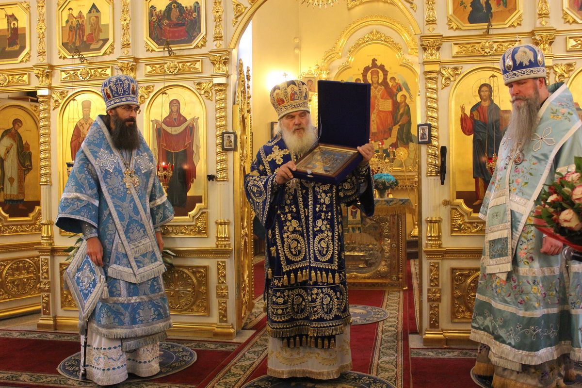 Митрополит Вениамин подарил епископу Иннокентию копию чудотворной Курской коренной иконы Божией Матери "Знамение".