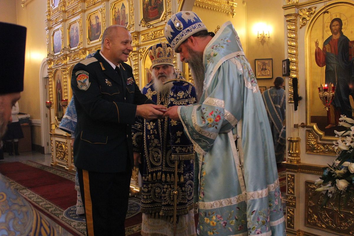 Далее архиепископ Кирилл вручил Синодальную грамоту епископу Иннокентию, викарию Владивостокской епархии во внимание к усердным трудам на благо Церкви и в связи с днём рождения.
