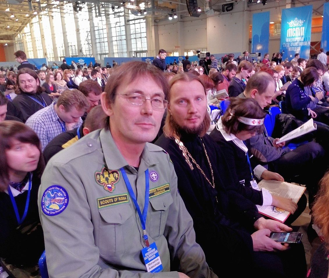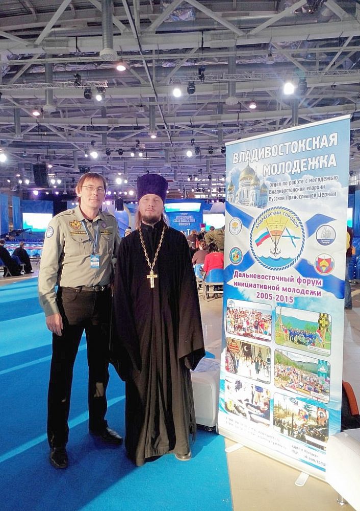 Делегаты Владивостокской епархии – руководитель епархиального отдела по работе с молодежью иерей Димитрий Винокуров и зам.руководителя отдела, руководитель Приморского отделения Братства православных следопытов Александр Ильич Жигжитов – представили в павильоне ВДНХ, где проходит съезд, проект Дальневосточного молодежного форума «Андреевский городок».