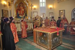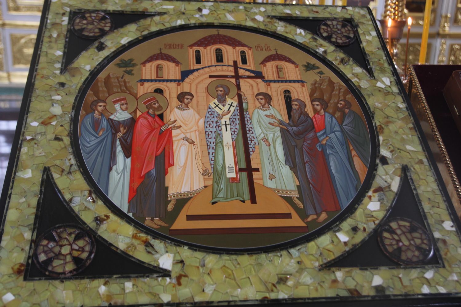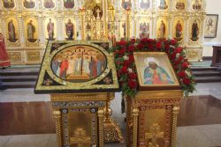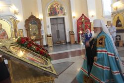 В Покровском соборе перед принесенным образом прошли службы Изнесения Честного Животворящего Креста и «медового Спаса». Прихожане могли приложиться к необычной иконе, выполненной на янтаре.