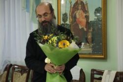 После литургии уже в трапезной настоятеля прихода поздравили с днем хиротонии. Протоиерей Олег Дикмаров преподнес букет цветов.