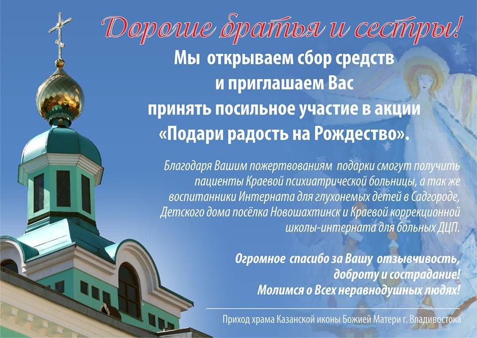 - Если вы желаете Подарить радость на Рождество, можете передать готовые подарки, конфеты, игрушки, канцелярские товары и все, чем можно порадовать детей и престарелых, в социальный отдел Владивостокской епархии (Океанский проспект, 44), тел.269-08-38.