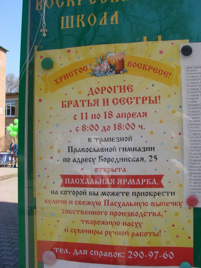 Накануне, в день Пасхи в Православной гимназии целый день проходил Пасхальный праздник для детей и взрослых. На "станциях", расположенных в разных уголках гимназического двора ребят ждали интересные задания – от росписи яиц, викторины и уроков звонарей. Того, кто успешно всё выполнил – ждали призы. На празднике были организованы выставка-продажа куличей и творожных пасх, приготовленных в трапезной гимназии (в приготовлении и росписи куличей традиционно принимали участие старшеклассники), "карпова уха", выставка-продажа сувениров, катание на лошади и пони. Неизменным успехом пользовался контактный "Домашний зоопарк". Городские ребятишки смогли рассмотреть, погладить и покормить барашка, кур с петухом, гусей, забавных поросят и семейство кроликов.