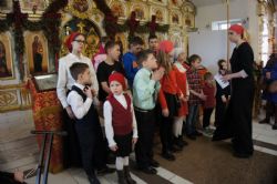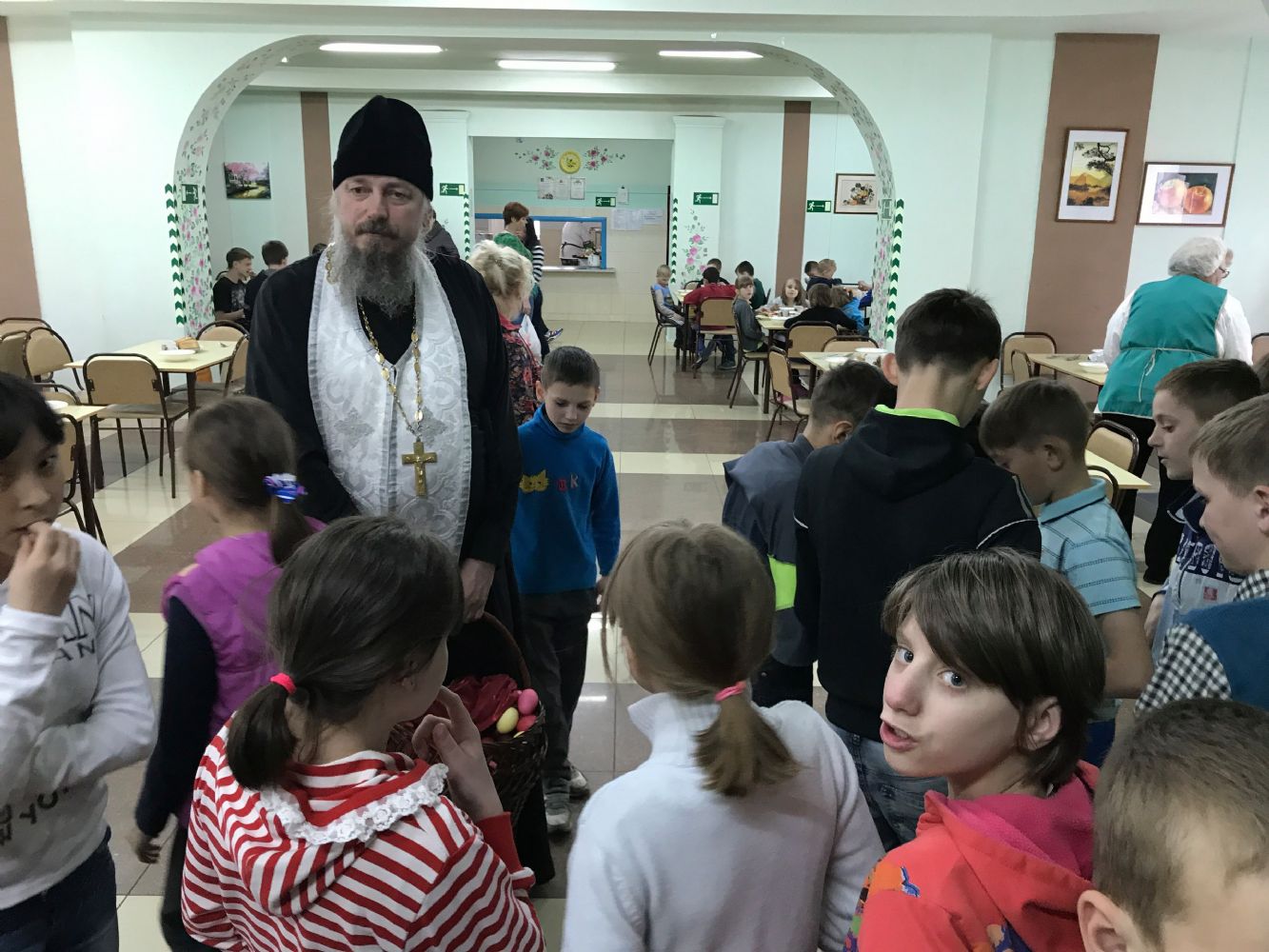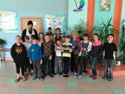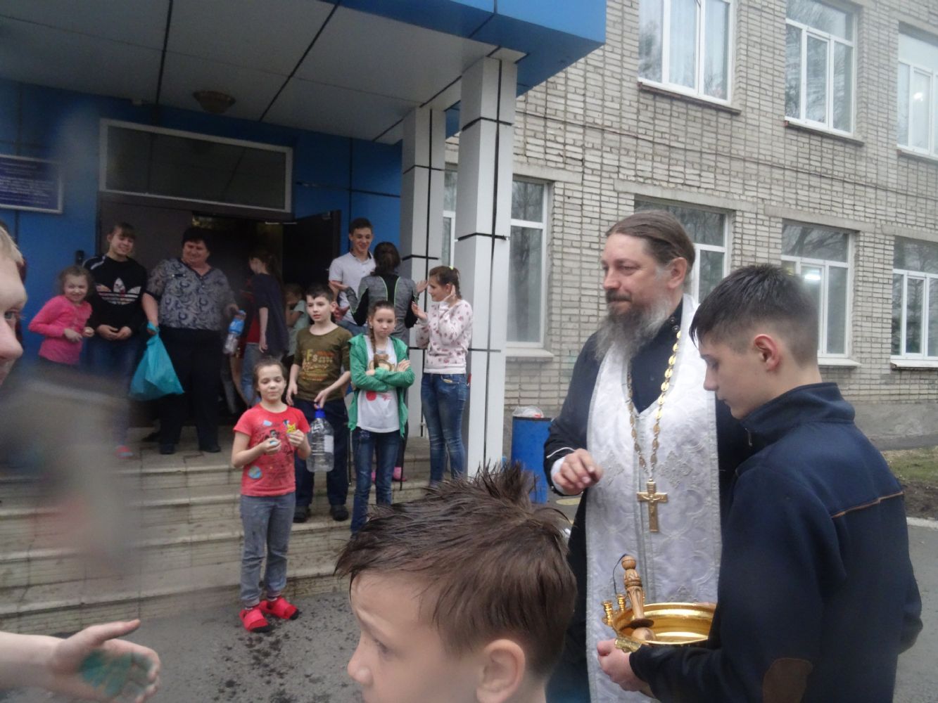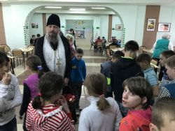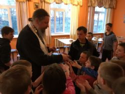 Сегодня воспитанники школы приняли участие в богослужении, о. Михаил окропил детей святой водой, а вместо занятий было праздничное угощение.