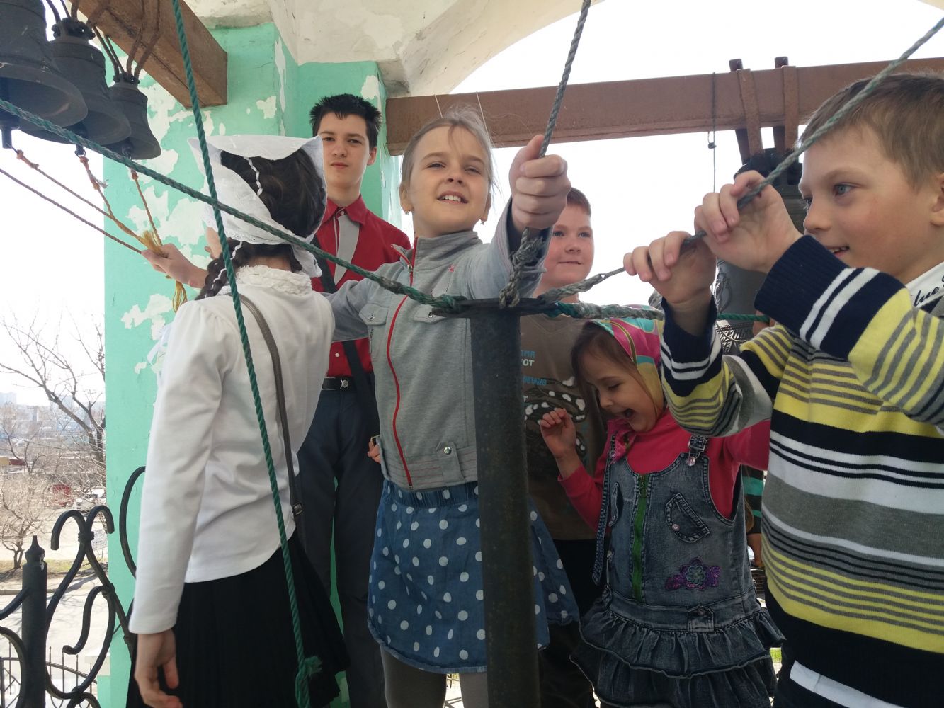 Владивосток. Храм Казанской иконы Божией Матери. В праздник Пасхи дети из Воскресной школы получили необыкновенный подарок от настоятеля храма о.Ростислава – возможность позвонить в колокола храмовой звонницы. Ребята с удовольствием исполнили собственные перезвоны, и это еще больше усилило торжественность светлого праздника, подготовку к которому они начали зараннее. Дети изготавливали Пасхальные сувениры, разучивали тропари и песни.