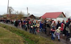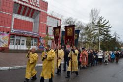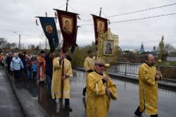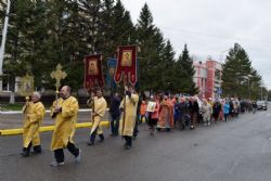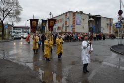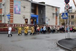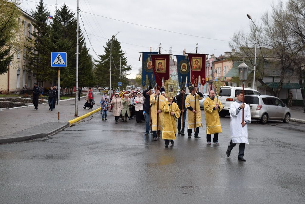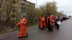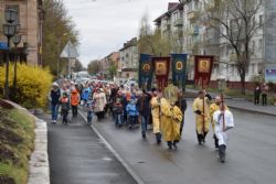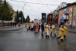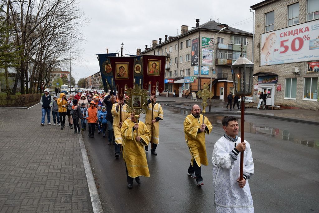 Построились мужчины с хоругвиями, за ними священство, певчие и все прихожане, начиная от детей учащихся Воскресной школы и заканчивая пожилыми. Всем участникам крестного хода раздали иконы. Впереди ехала машина с колоколами, батюшка дал возглас и хор запел тропарь Пасхи -«Христос Воскресе из мертвых, смертию смерть поправ, и сущим во гробех живот даровав». Крестный ход тронулся в путь! Все шли радостные и воодушевленные, с колокольным звоном, пением церковных песнопений, окроплением святой водой. Настоятель о. Владимир Капитанюк с Пасхальным крестом-трехсвечником и Евангелием в руках, всех прохожих встречал громкогласным приветствием - «Христос Воскресе!» Проходя перекрестки осенял их на все стороны крестным знамением и окроплением святой водой.