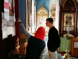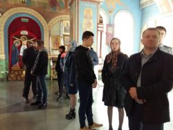 В продолжение встречи гости посетили храм. Ирина Юрьевна Карайбеда, ответственная за молодёжную работу на приходе, кратко рассказала о значении храма в жизни христианина, таинствах покаяния и причащения, помощи святых угодников Божиих, Пасхе. Сотрудники храма ответили на вопросы. Напоследок экскурсия на детскую Пасхальную выставку. Каждый из гостей получил в подарок освящённый кулич.