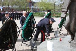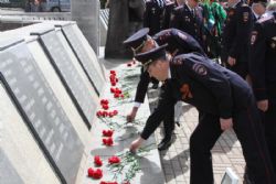 Участники Великой Отечественной войны, ветераны, действующие сотрудники органов внутренних дел возложили венки и цветы к памятнику Воинам правопорядка, погибшим при исполнении служебного долга, зажгли поминальные свечи.