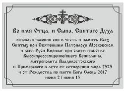 Владивосток. 15 июня 2017 года помощник благочинного I округа протоиерей Андрей Машанов на месте строительства часовни в честь Всех Святых на Морском кладбище освятил закладной камень и вложил в него капсулу с закладной грамотой.