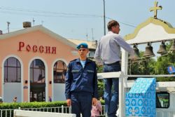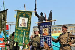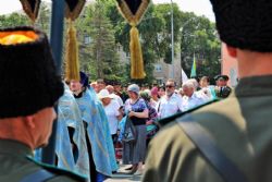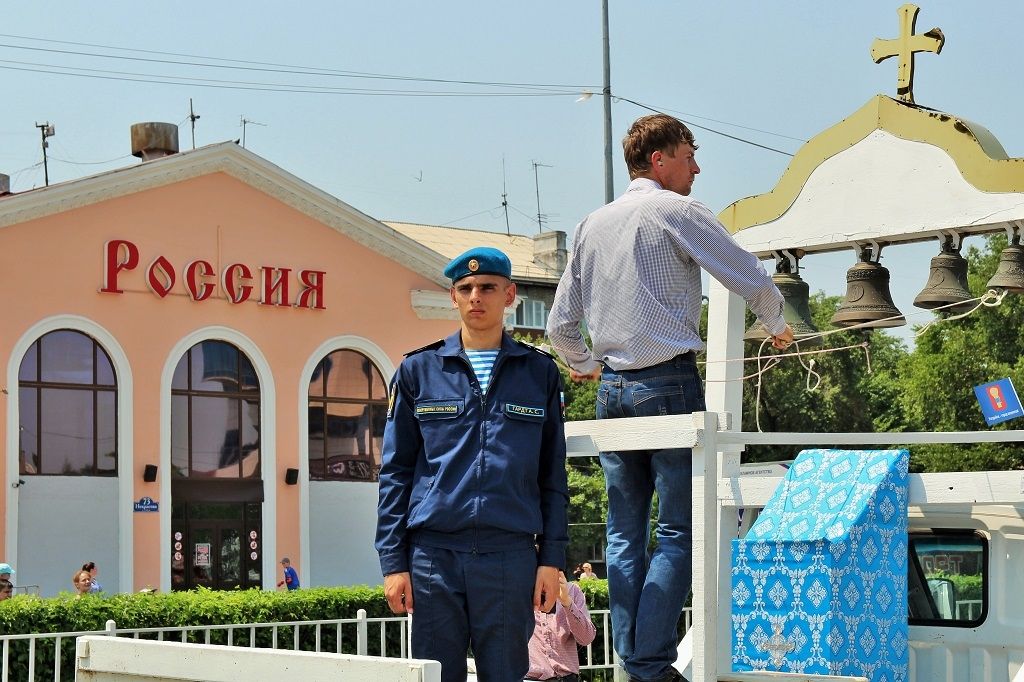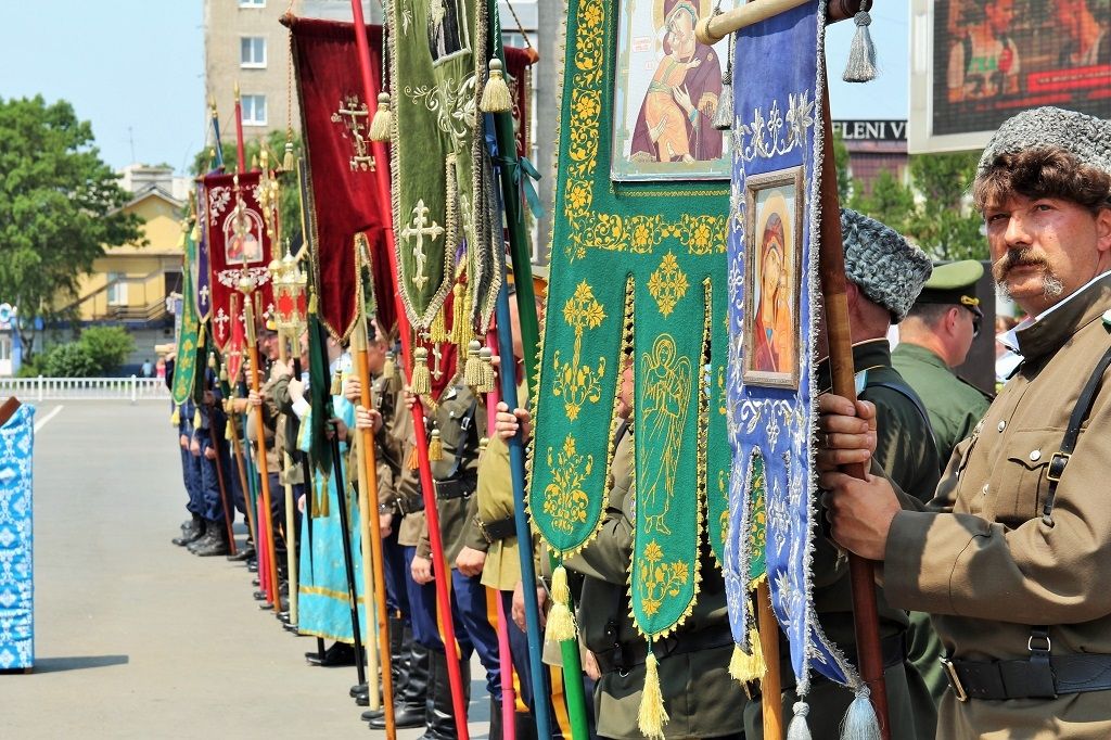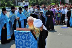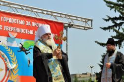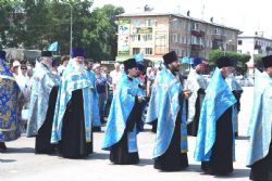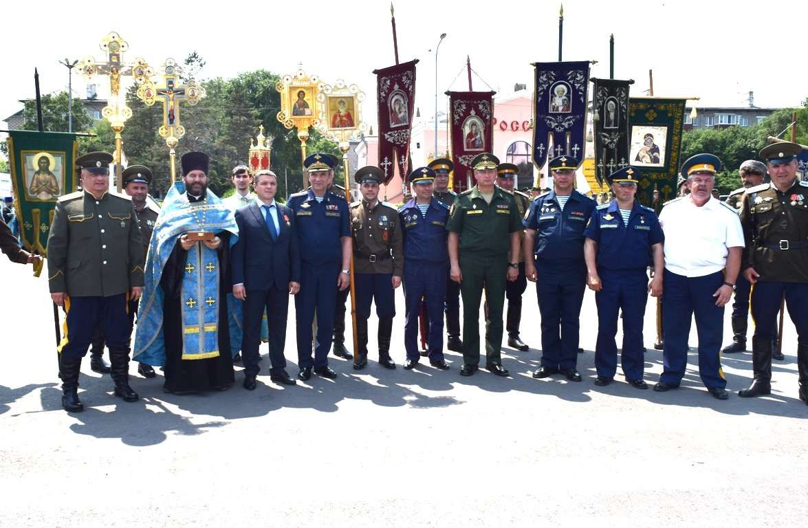 После возложения цветов к вечному огню участники митинга под колокольный звон передвижной звонницы выдвинулись Крестным ходом на центральную площадь Уссурийска. Главной святыней крестного хода стал образ Покрова Божией Матери, которым благословил автопробег Патриарх Московский и Всея Руси Кирилл.