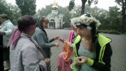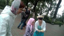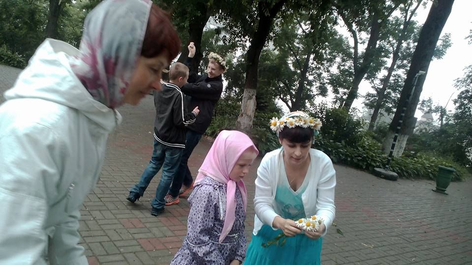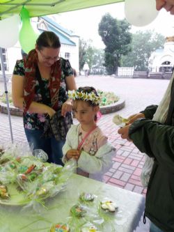 Батюшка пригласил всех на свежий воздух. Во дворе храма развернулась Благотворительная ярмарка, а для детей – приходских ребята и воспитанников детских домов –устроили настоящий праздник. Территория храма превратилась в мастерскую по изготовлению венков из ромашек. Ромашка – символ это праздника, символ – любви, юности и чистоты. Венки лучше всего удавались девочкам, но и мальчики не отставали.