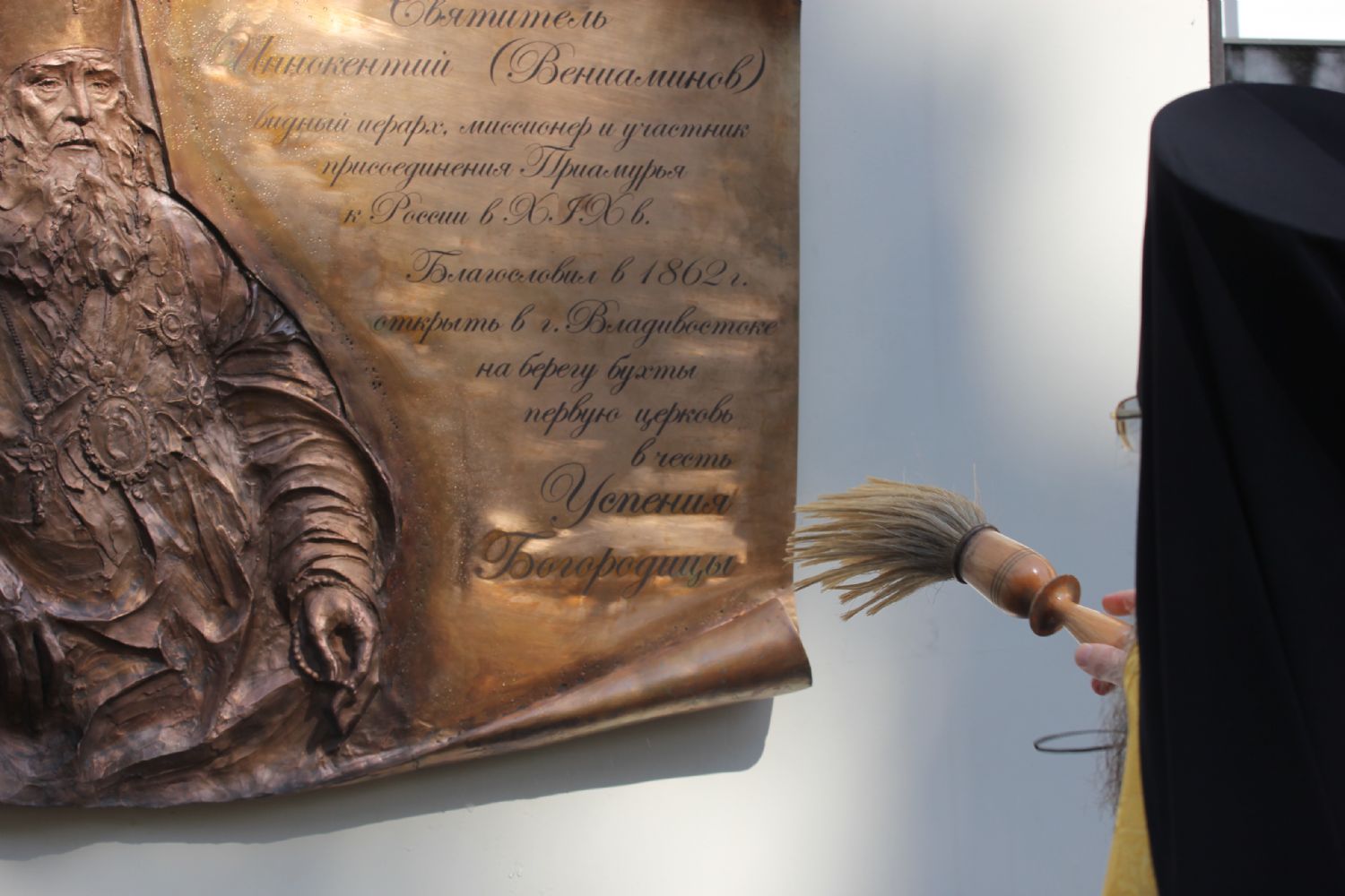 Барельеф изготовлен из бронзы в Москве. Скульптор Алексей Селиванов. Работа продолжалась полгода – с февраля по август 2017 г. На доске написано: "Святитель Иннокентий (Вениаминов) видный иерарх, миссионер и участник присоединения Приамурья к России в XIX веке. Благословил в 1862 году открыть в г. Владивостоке на берегу бухты первую церковь в честь Успения Богородицы".