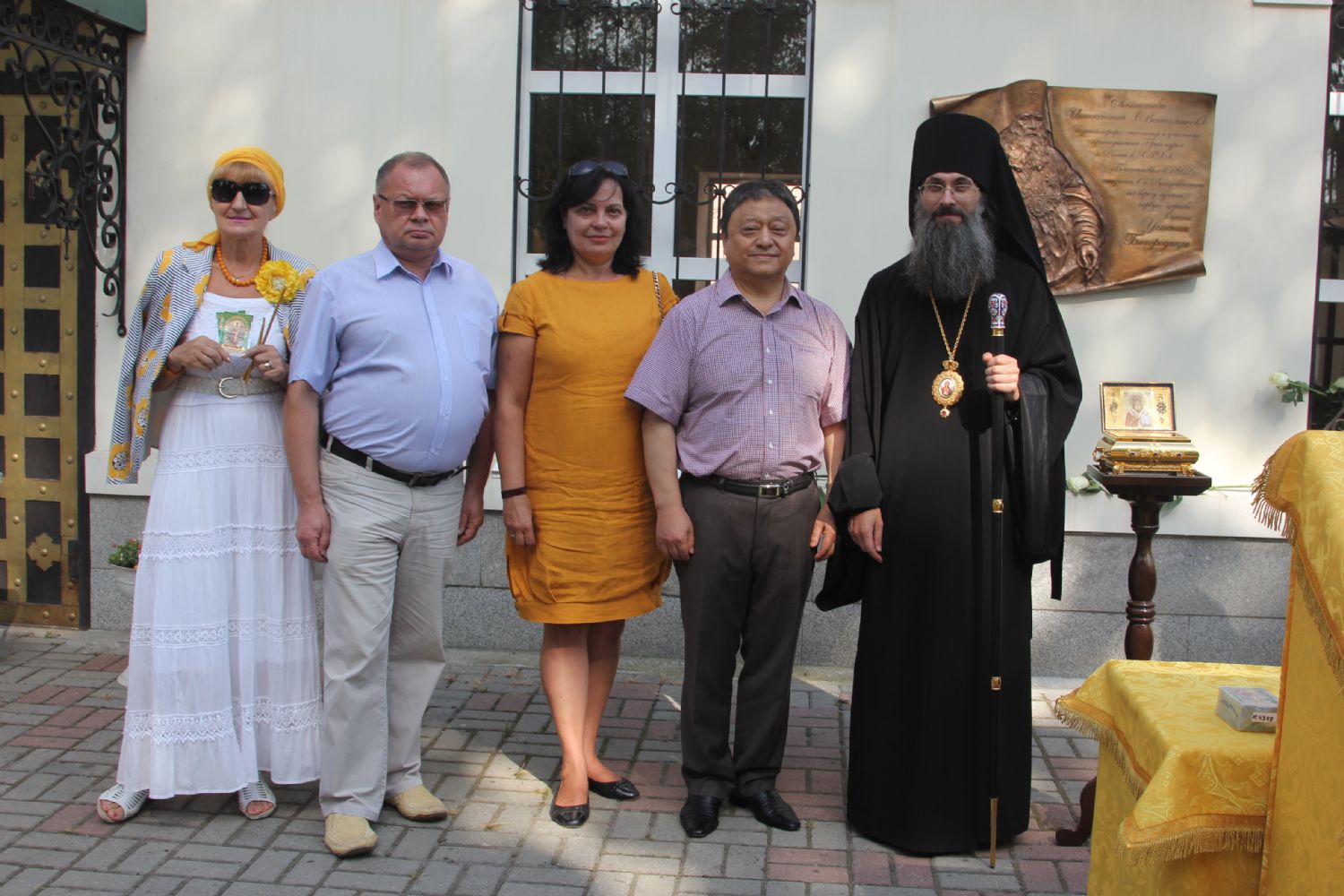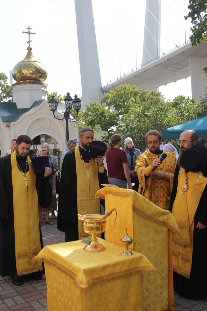 Церемонию возглавил викарий Владивостокской епархии епископ Уссурийский Иннокентий — нынешний настоятель Успенского храма. Из алтаря во двор Успенского храма, к месту установки барельефа была принесена святыня — ковчег с частицей мощей святителя Иннокентия, доставленный в храм в мае этого года. Перед святыней был совершен благодарственный молебен святителю, который совершил епископ Иннокентий в сослужении ключаря Успенского храма протоирея Олега Дикмарова и духовенства. За богослужением владыка Иннокентий окропил открытую мемориальный барельеф святой водой. Событие завершилось многолетием в исполнении хора Успенского храма и колокольным звоном.