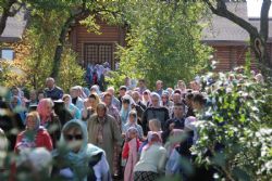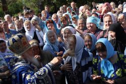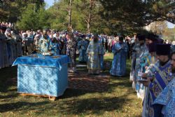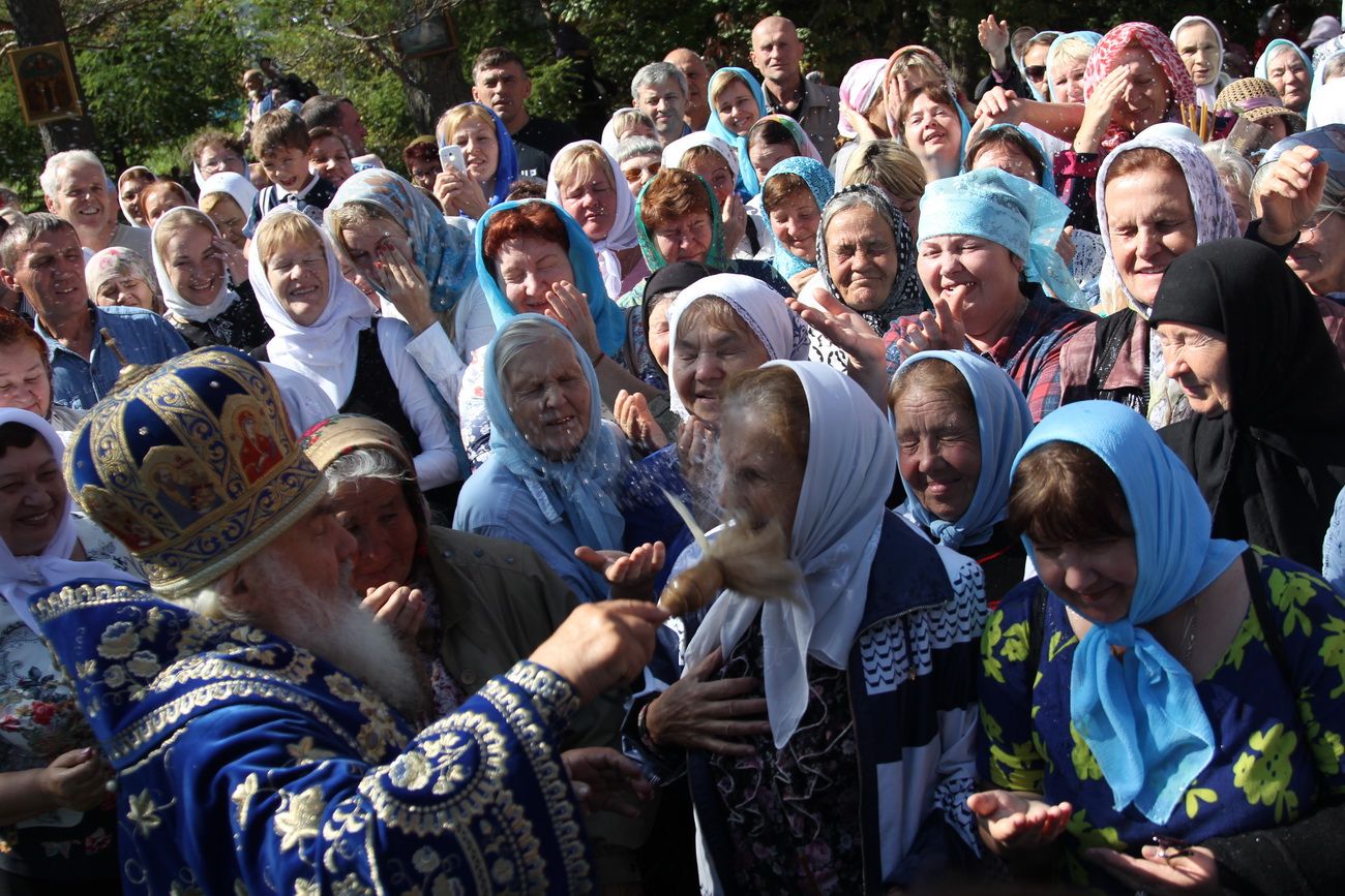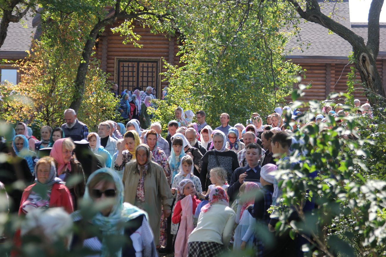 Божественная литургия совершалась на площадке между монастырскими храмами. Три десятка священнослужителей и сотни паломников, прибывших с приходов на множестве автобусов, при всем желании не смогли бы поместиться в храме. Накануне, на всенощном бдении, паломников было меньше, поэтому владыка Вениамин служил в восстановленном деревянном храме в честь Рождества Пресвятой Богородицы рядом с могилкой первой настоятельницы – игумении Павлы.