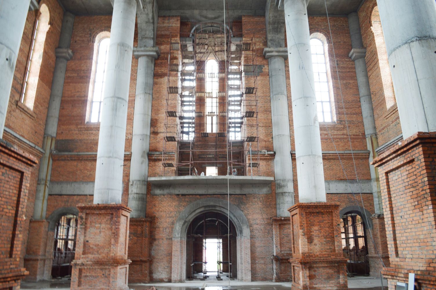 В настоящее время завершаются затирочные работы кирпичной кладки, продолжаются кровельные работы, ведется фальцевание фасадных элементов и конструкций. Начаты работы по устройству водосборников и водосточной системы.