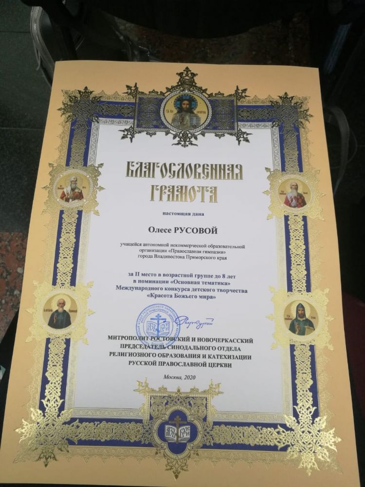 В Конкурсе приняли участие 177 епархий Русской Православной Церкви, на II (итоговый) этап поступило 3115 работ. В номинации «Основная тематика», до 8 лет 2-е место заняла ученица 1 класса Православной гимназии г. Владивостока Русова Олеся (7 лет) с работой «Я помню». Митрополит Меркурий поздравил лауреатов с победами и пожелал им дальнейших творческих успехов. Кроме того Олеся Русова получила грамоту и специальный приз детского семейного телеканала "Радость моя" и детского журнала "Шишкин лес".