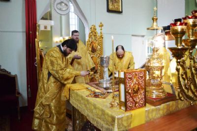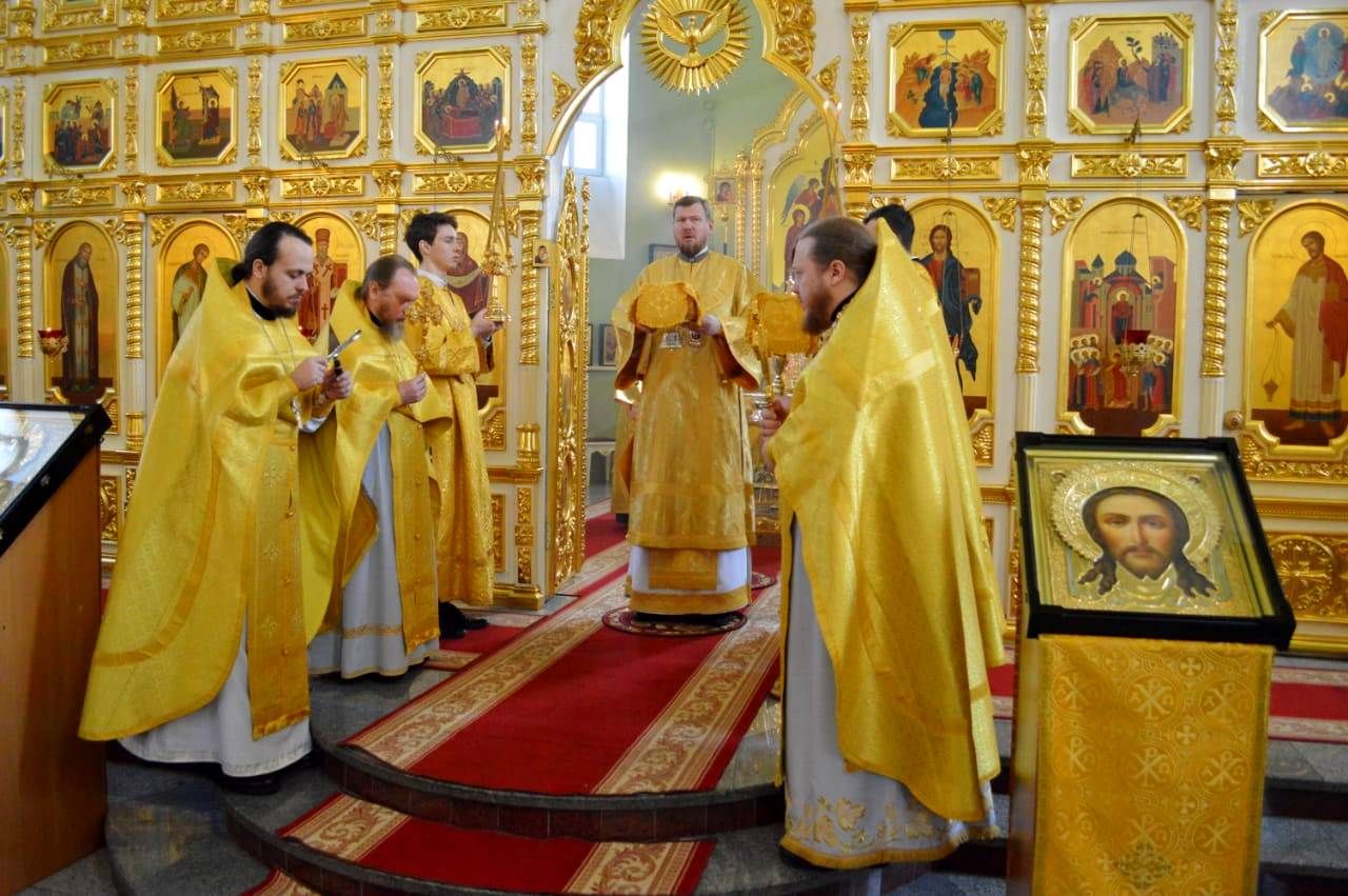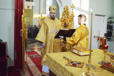 Его Высокопреосвященству сослужили: ключарь собора иеромонах Иоанн (Костин), игумен Антоний (Каменчук), игумен Тихон (Иршенко), иерей Владимир Плотников.