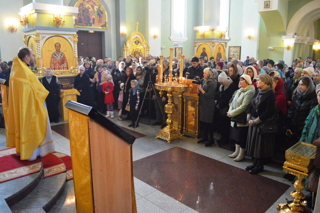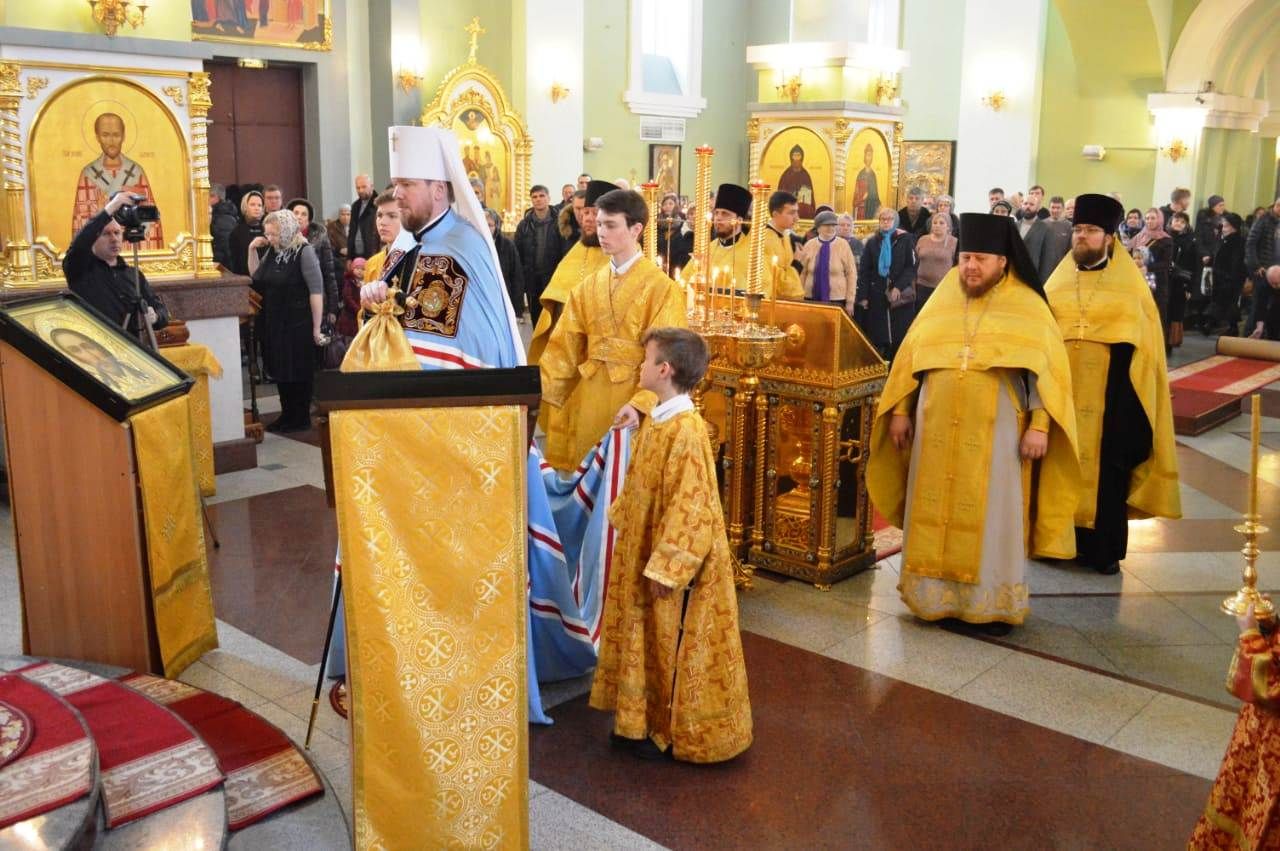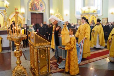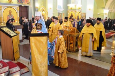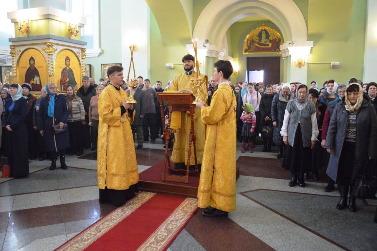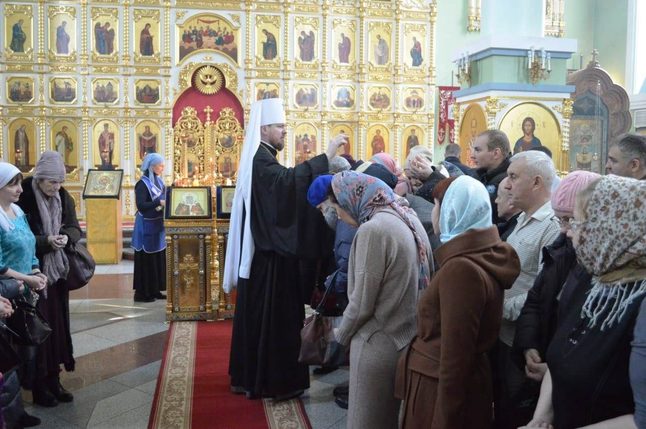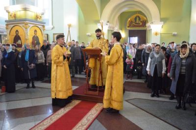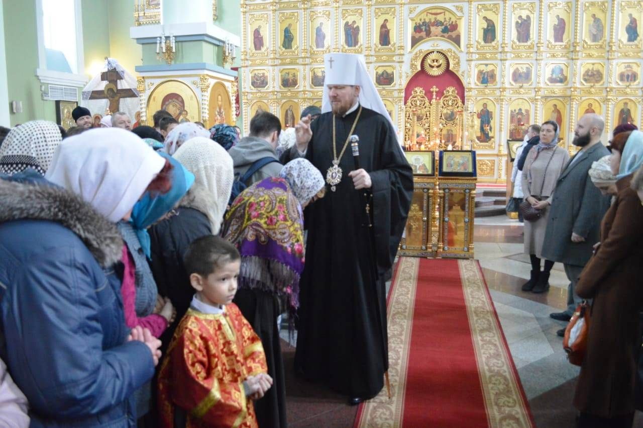 В завершение богослужения владыка Владимир обратился к молящимся с архипастырским словом: «Будем, дорогие братья и сестры, стремиться соблюсти и внешнюю и внутреннюю составляющие Святой Четыренадесятицы, в которую мы вступим с вами уже завтра. Здесь не должно быть самопревозношения над теми людьми, которые не постятся в силу некоторых причин, хотя последние опросы, которые можно найти в интернете, говорят, что каждый пятый человек живущий на территории России готов по крайней мере от мяса отказаться на Великий пост — все больше становится постящихся, и любой человек, если он не постился, может попробовать свои силы в постном делании, попытаться попоститься день, два, три, может быть неделю — первую седмицу или Страстную седмицу перед Пасхой. Может быть удастся кому-то, кто раньше не постился, присовокупить к этим постным двум седмицам Крестопоклонную неделю, которая на середину поста приходится. Может быть кто-то от какого-то определенного вида пищи или от каких-то греховных своих пристрастий сможет отказаться в эти дни. Все это возможно с помощью Божией. Будем не на свои силы рассчитывать и полагаться, будем призывать помощь Бога, дабы Он нас укрепил. Помог бы нам увидеть истинный смысл всех тех аскетических упражнений, которые мы на себя добровольно по благословению Святой Церкви принимаем в этот период церковного года. Пусть Господь нас крепит, будем помнить, что к посту нужно подходить с разумением, с рассуждением. Это касается тех людей, которые имеют проблемы со здоровьем, беременных женщин, всех тех, кто трудятся на тяжелой физической работе. Детям надо подходить к посту также с рассуждением. Не нужно никакое самоистязание. Господь в этом не нуждается, и нам это не нужно. Мы должны укрепиться духовно. Не впасть в уныние, ни в какое-то расхолаживание, ибо такие плоды поста будут не от Бога, а от лукавого», — сказал митрополит Владимир.