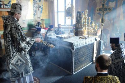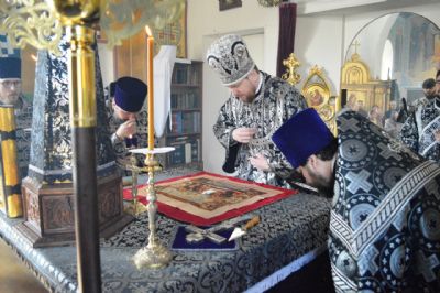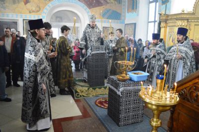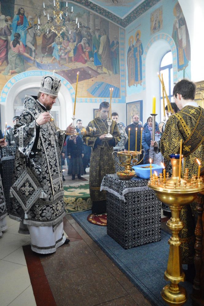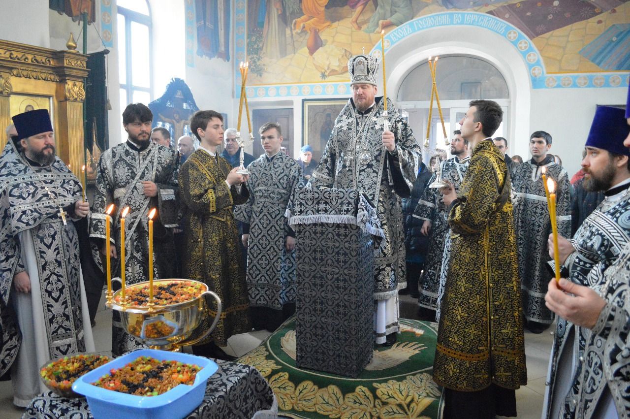 По окончании литургии владыка Владимир в сослужении духовенства совершил чин молебного пения мученику Феодору Тирону с освящением колива.
