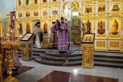 Его Высокопреосвященству сослужили: ключарь собора иеромонах Иоанн (Костин), игумен Антоний (Каменчук), иерей Владимир Плотников.