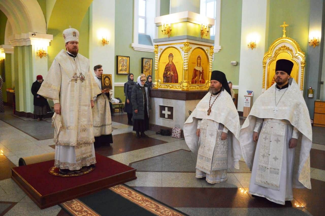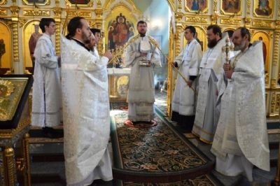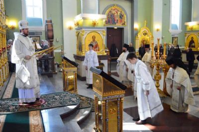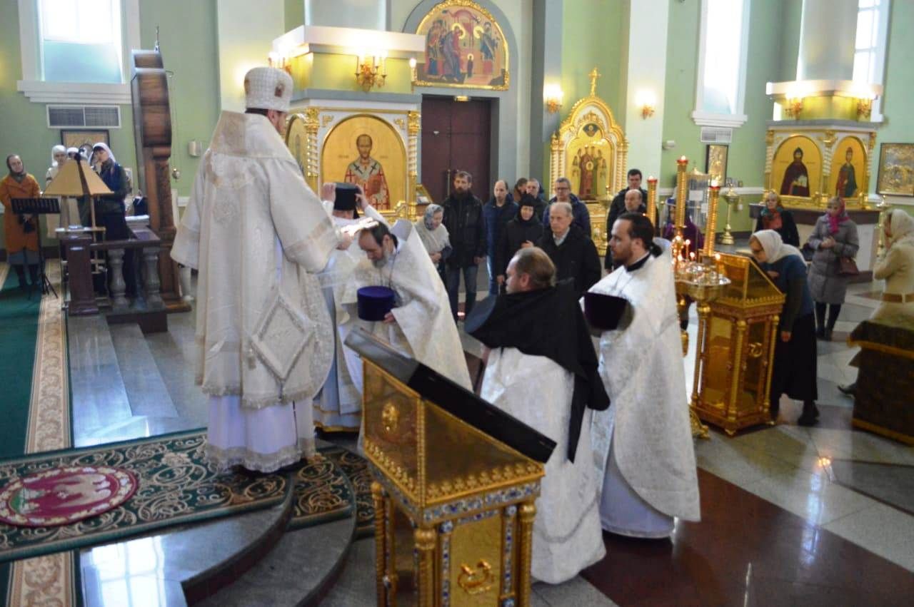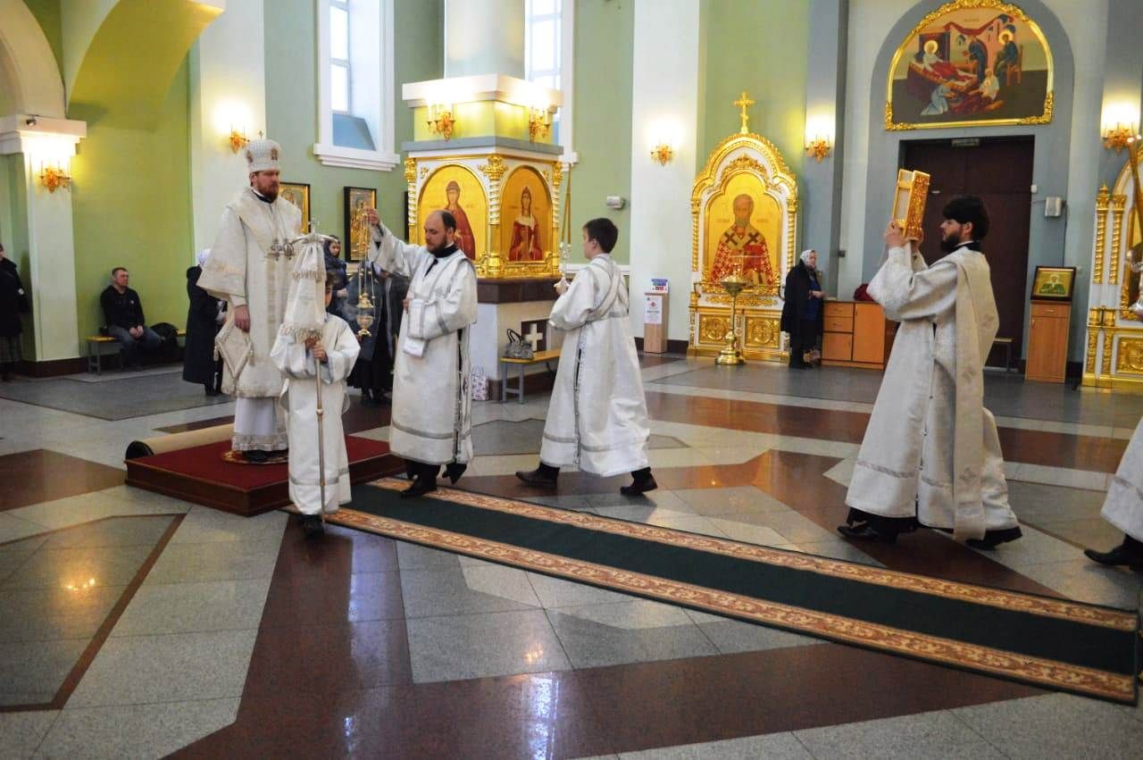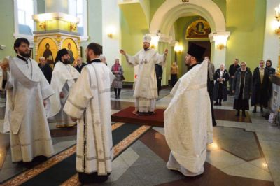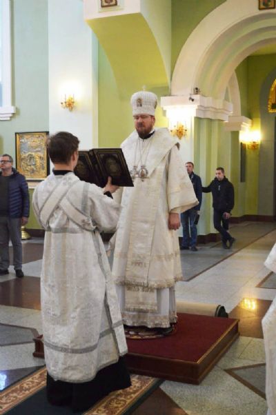 Его Высокопреосвященству сослужили: ключарь собора иеромонах Иоанн (Костин), игумен Антоний (Каменчук), протоиерей Игорь Шевчук, иерей Владимир Плотников.