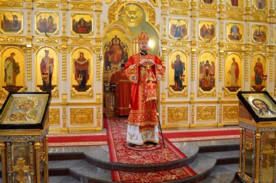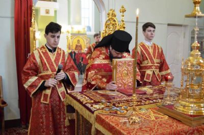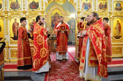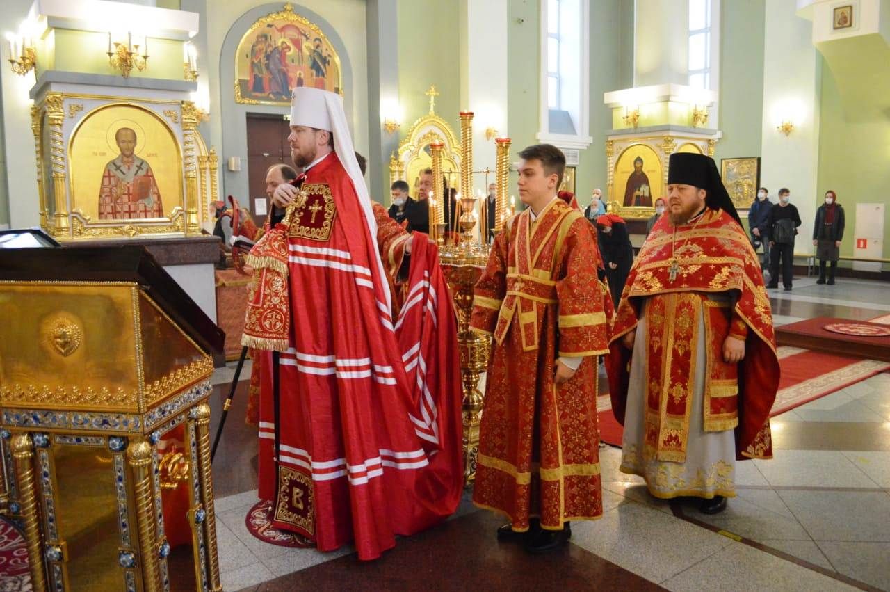 Его Высокопреосвященству сослужили: ключарь собора иеромонах Иоанн (Костин), игумен Тихон (Иршенко), иерей Владимир Плотников.