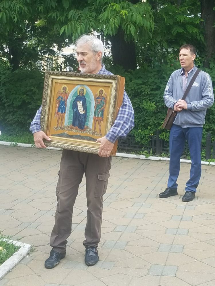 Перед началом крестного хода протоиерей Игорь Шевчук и иерей Владимир Плотников совершили молебен у памятника императору Николаю II в Покровском парке. Помолиться перед всероссийскими святынями в главный храм Владивостока прибыли несколько делегаций прихожан с городских храмов. В условиях вредоносного поветрия соблюдались профилактические меры безопасности: маски и обработка антисептиками в храмовых помещениях и соблюдение дистанции в крестном шествии.