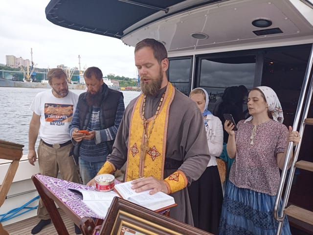 По пути морской Крестный ход сделал остановку в б.Золотой Рог, где был совершен иереем Даниилом Есаковым с активными прихожанами молебен с чтением акафиста Животворящему Кресту Господню, освящен катер, предоставленный капитаном Андреем и его помощником Максимом.