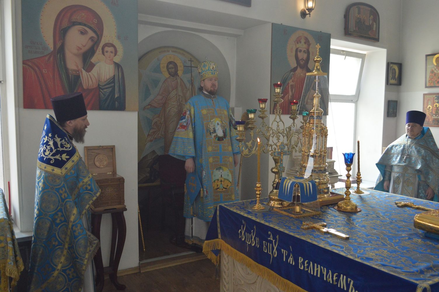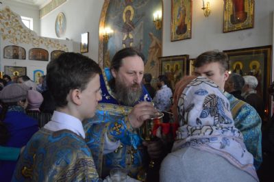 По отпусте литургии было совершено славление Пресвятой Владычице нашей Богородице и Приснодеве Марии в честь праздника Ея Благовещения.