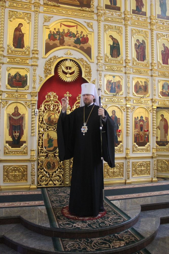 Его Высокопреосвященству сослужили: исполняющий обязанности ключаря Покровского собора иерей Владимир Плотников, игумен Антоний (Каменчук), иерей Максим Точуков, иерей Дионисий Ищенко.