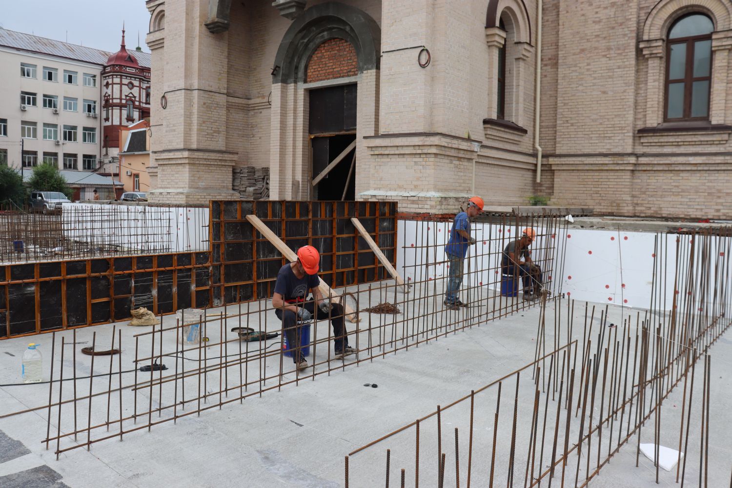 Владивосток. 5 августа 2021 года митрополит Владивостокский и Приморский Владимир возглавил очередное рабочее совещание на строительной площадке Спасо-Преображенского кафедрального собора.