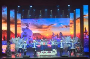 В первой части Рождественской елки длительностью 50 минут в главном зале Дворца культуры угольщиков в представлении "Под счастливой звездой Рождества" приняло участие большое количество творческих коллективов и дети из воскресной школы храма Богоявления.