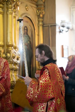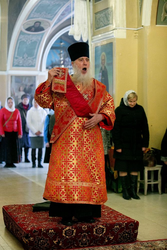 Владыке сослужили секретарь Епархиального управления иеромонах Серафим (Пасанаев), настоятель храма протоиерей Михаил Ильин, клирики храма протоиерей Павел Матвеев, иерей Димитрий Иванов, иерей Сергий Асланов, иерей Павел Дурандин, протодиакон Михаил Козловский, диакон Александр Жирнов и диакон Димитрий Смирнов.