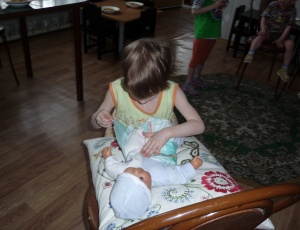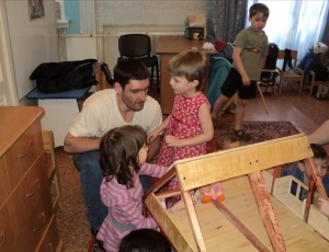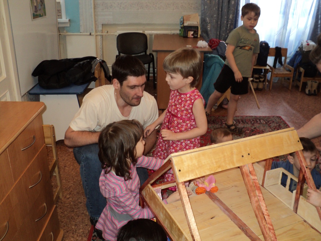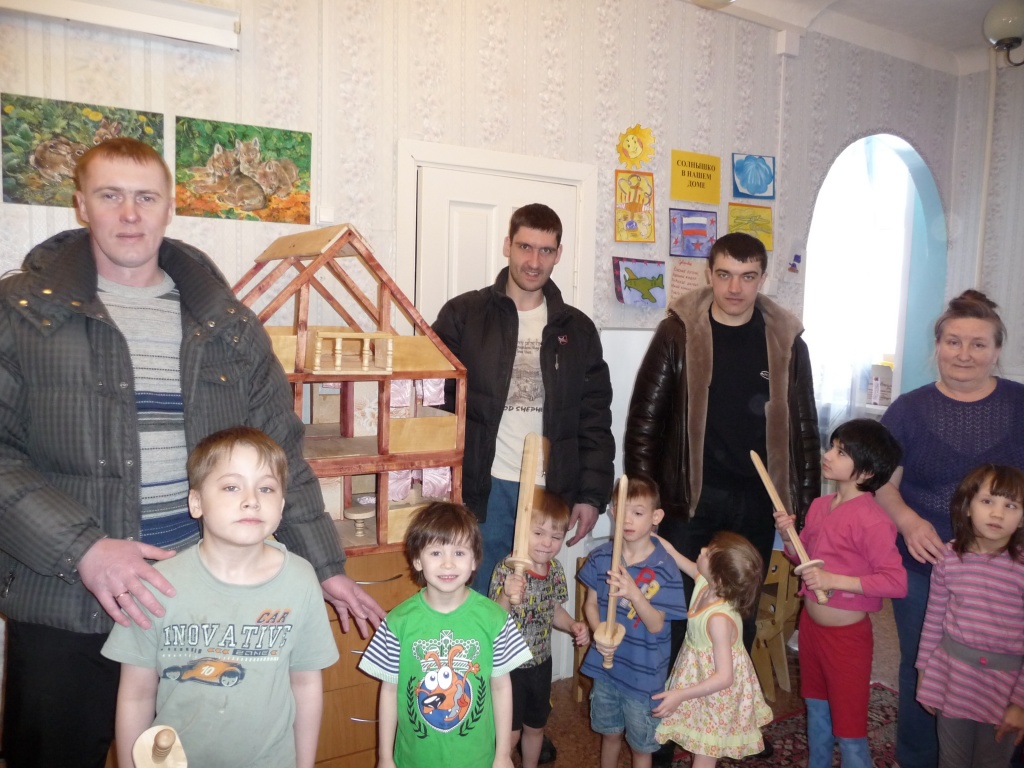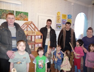 Сотрудники Епархиального Центра подарили ребятам подарки: раскладной игрушечный домик, в котором могут разместиться сразу несколько кукол и резные мечи из дерева, для игры в мушкетеров.