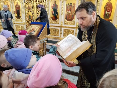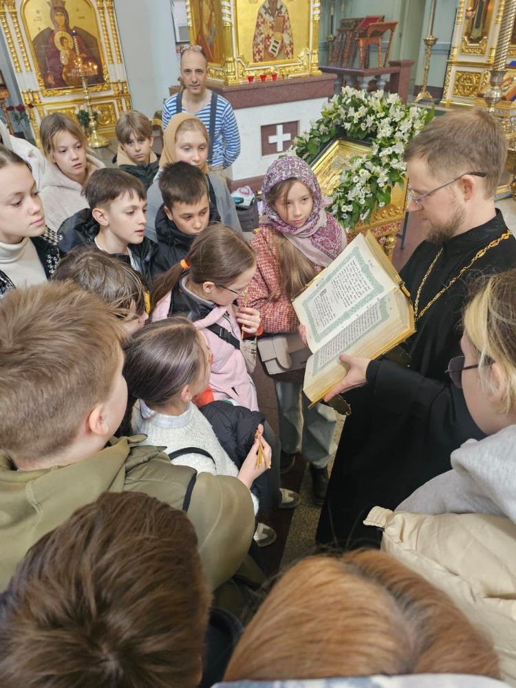 Иерей Иоанн Караман провел детей по храму, рассказав о значении священного пространства, а также показал им богослужебные предметы: Евангелие, кадило, сосуды для Таинств и другие элементы церковной утвари. Дети с интересом слушали пояснения, задавали вопросы и даже смогли рассмотреть некоторые предметы вблизи.
